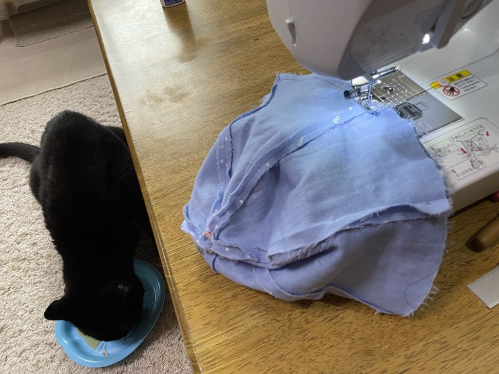 愛猫ラッキーのおやつタイムと、縫い縫いタイムが重なることが多く、はじめはミシンの音にちょっと驚いていましたが、もうすっかり慣れたようです。