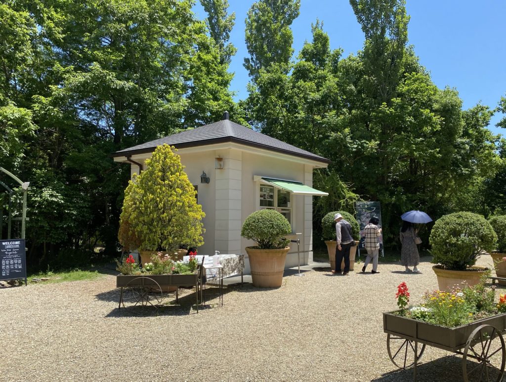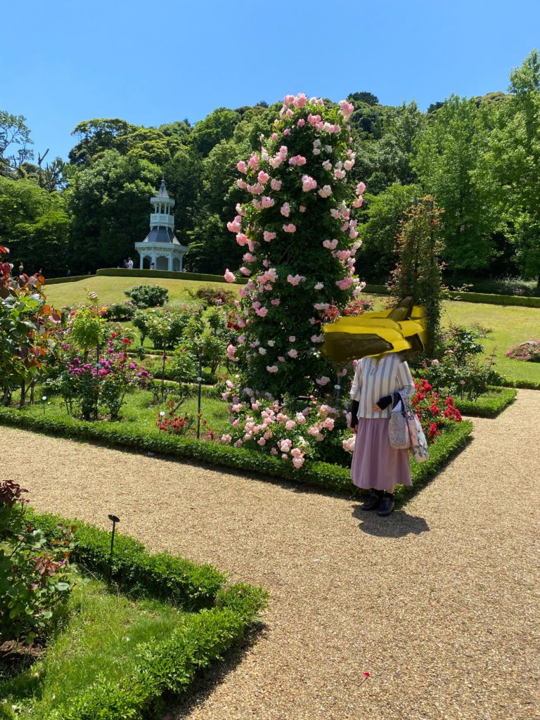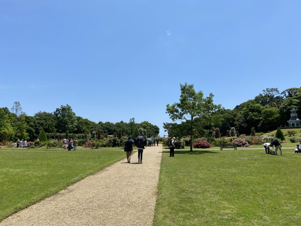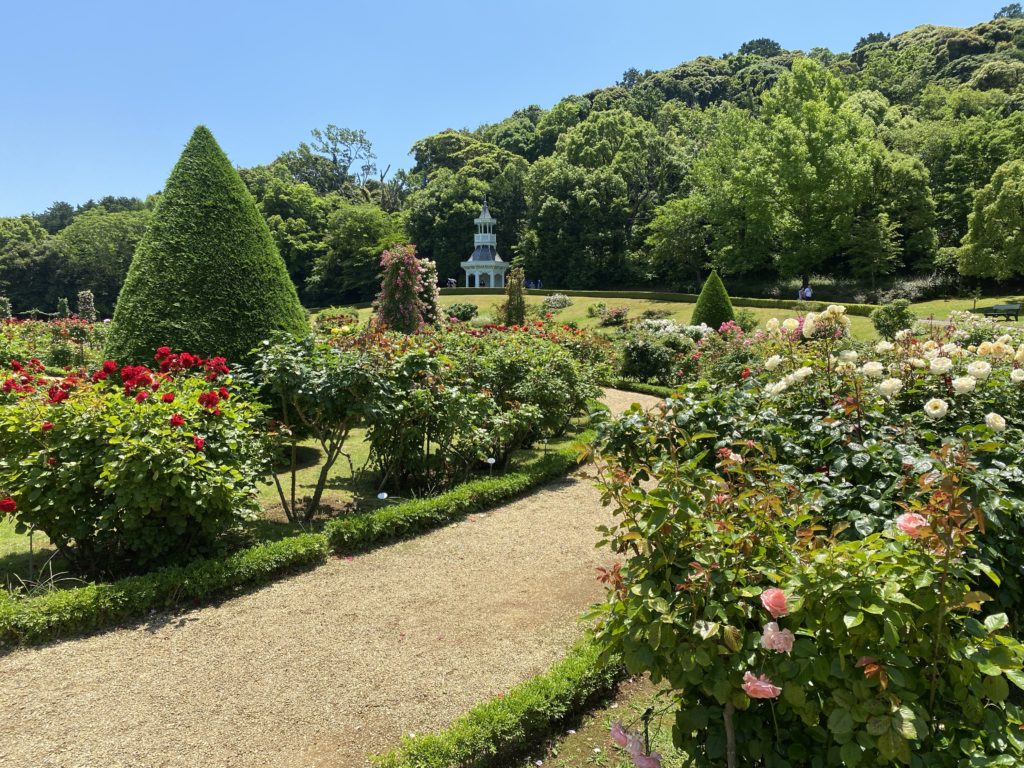 写真の左側の奥に、キオスクというローズガーデンを一望できる建物が見えています。