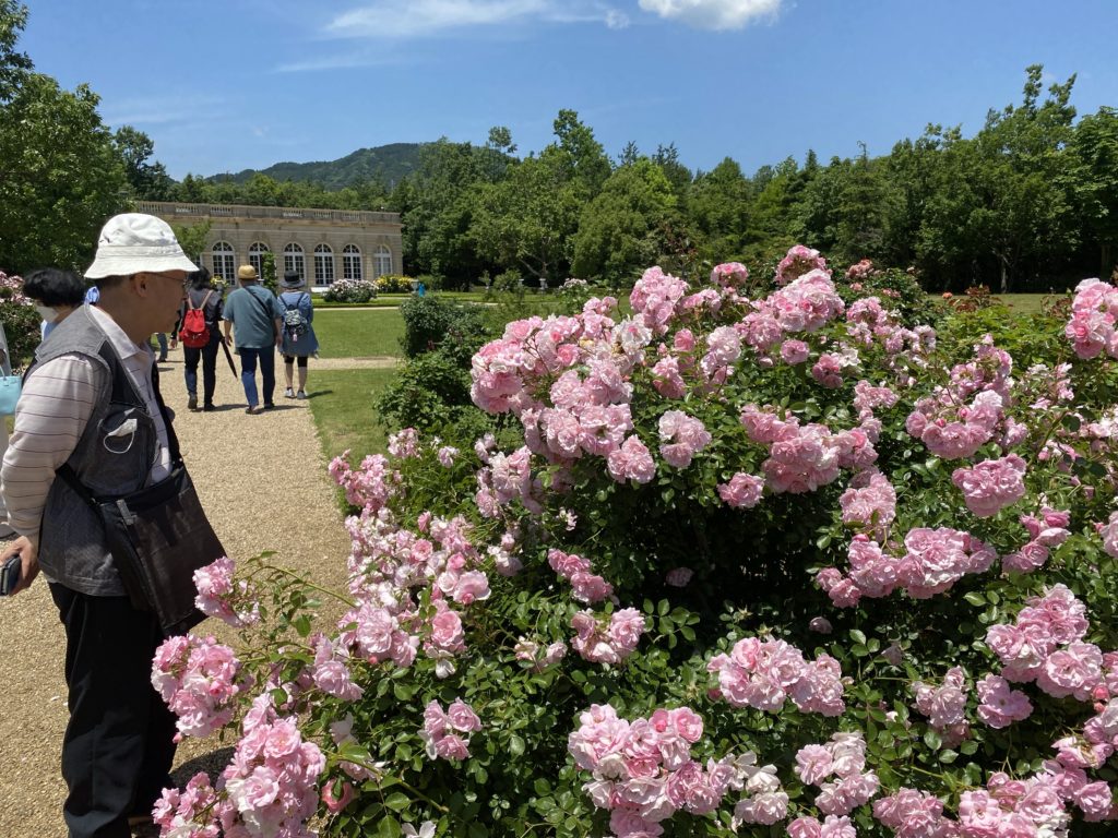 雑草もほとんど見当たりません。あちらこちらでバラのお世話をする人達が、汗だくで手入れをしていました。